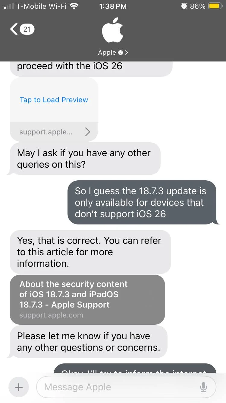 Un autre détail qui ressort est que cette mise à jour était disponible en version bêta, donc, en théorie, vous pouvez l’installer si vous activez le programme bêta d’iOS 18.7. Ce serait la seule alternative pour ceux qui possèdent un iPhone compatible avec iOS 26 et refusent de le mettre à jour. Un représentant du support Apple a expliqué qu’iOS 18.7.3 n’est disponible que pour les appareils qui ne prennent pas en charge iOS 26.